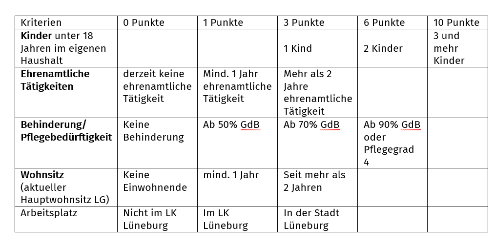 Punkte gibt es auch für im Haushalt lebende Kinder, eine ehrenamtliche Tätigkeit und/oder eine Behinderung eines Bewerbers beziehungsweise für die Pflege einer pflegebedürftigen Person (Kind, Partner, Eltern) mit Pflegegrad 4 im Haushalt.