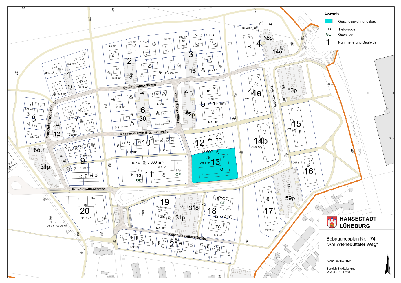 Baufeld 13: Fläche 2.301 m²; Wohnen allgemein (WA6), GRZ 0,5, Vollgeschosse III, Firsthöhe 14m, offene Bauweise; TG verpflichtend.