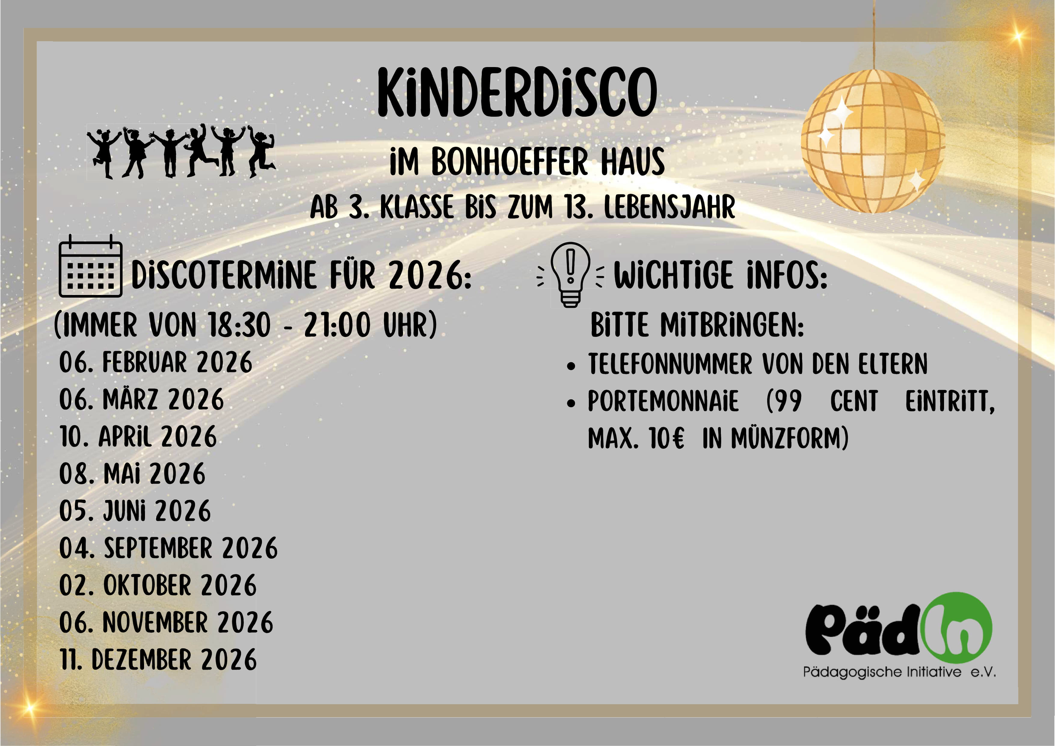 An mehreren Terminen lädt die Pädagogische Initiative (PädIn) Lüneburg e. V. zur Kinderdisco ins Bonhoeffer-Haus ein. Die Disco findet an folgenden Terminen jeweils von 18:30 bis 21 Uhr statt: