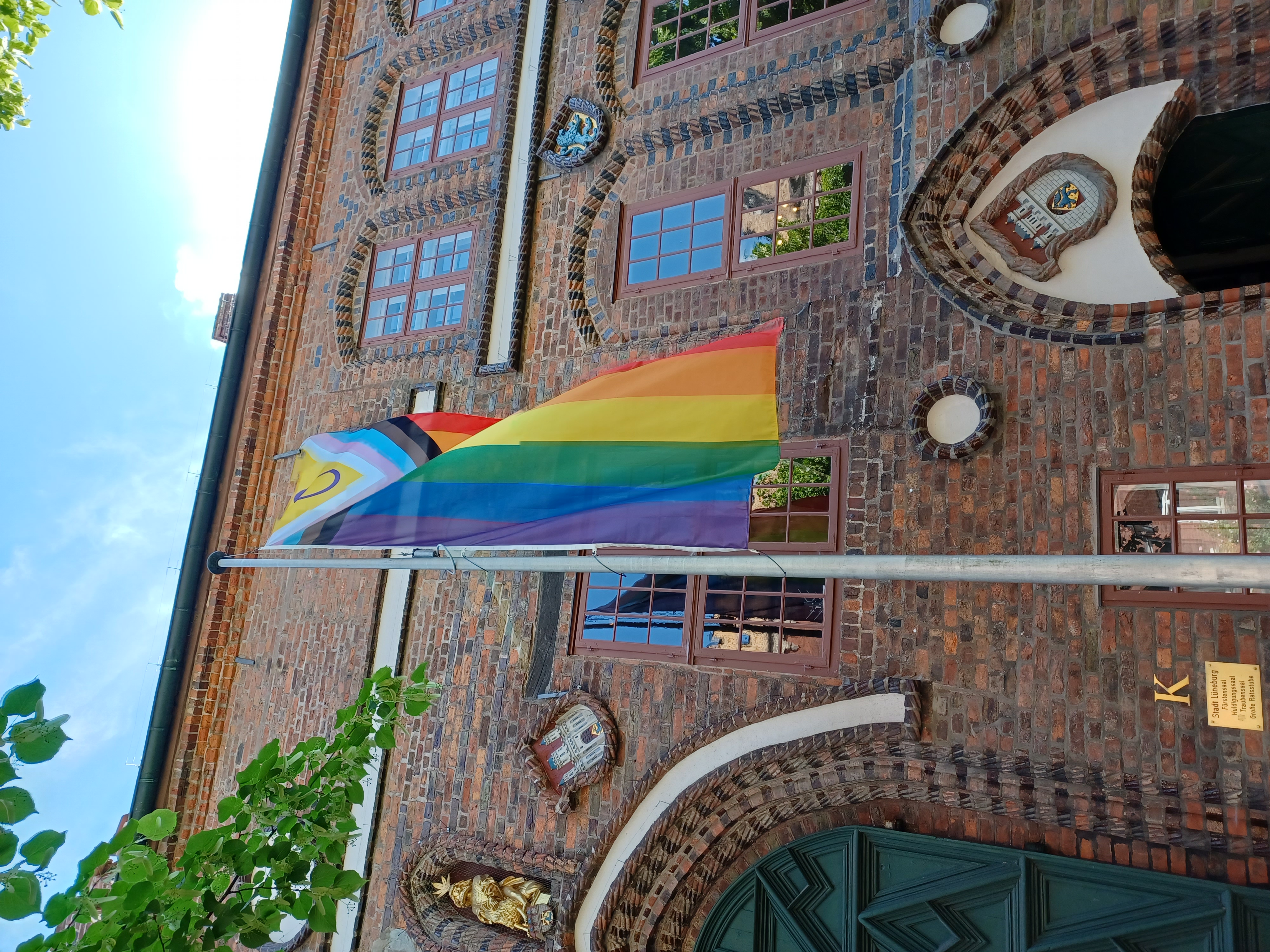 Die gehisste Regenbogenfahne am Rathaus zum 17. Mai.