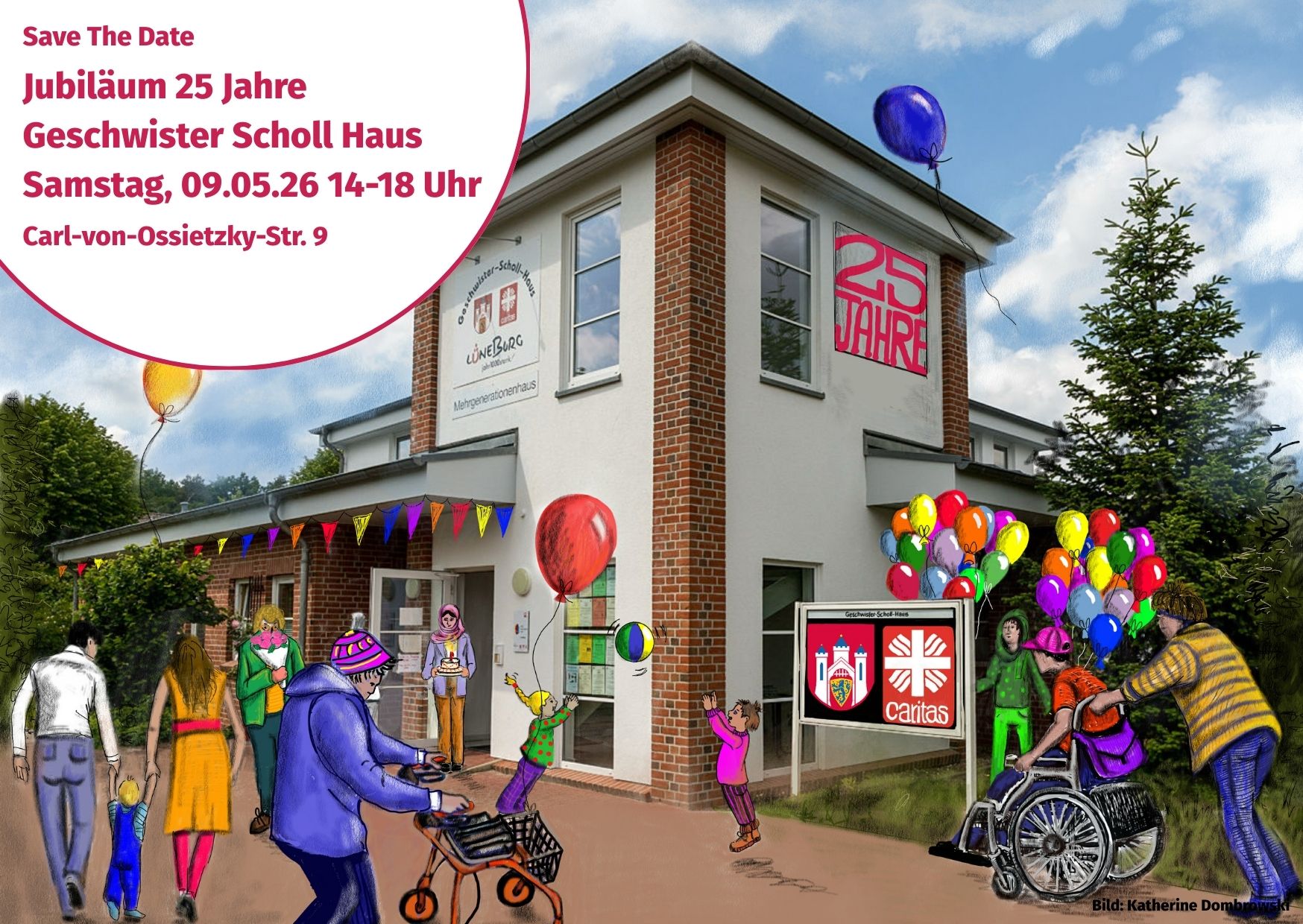 Zur Jubiläumsfeier am Samstag, 9. Mai 2026, sind alle Menschen eingeladen, die sich dem Haus verbunden fühlen (wollen). Los geht es um 14 Uhr im Geschwister-Scholl-Haus, Carl-von-Ossietzky Straße 9.