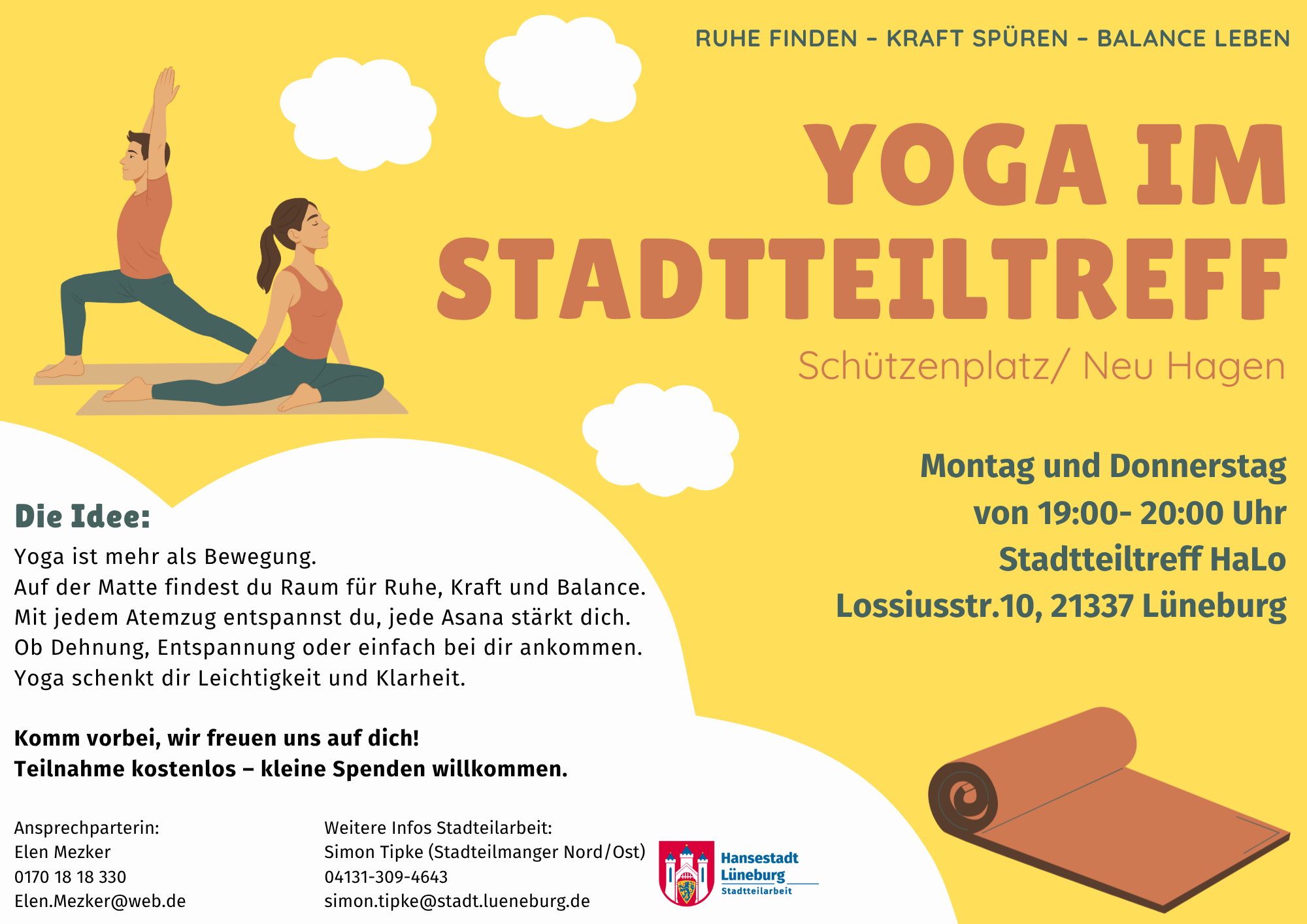 „Ruhe finden – Kraft spüren – Balance leben“ heißt es jeden Montag und Donnerstag von 19 bis 20 Uhr beim Yoga im Stadtteiltreff HaLo.