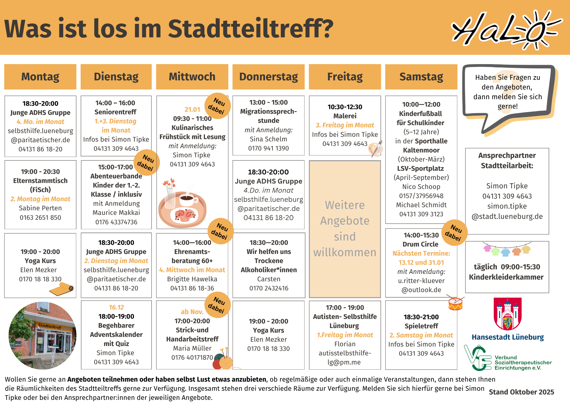 Zu den einzelnen Angeboten im Wochenplan können Sie sich direkt an die jeweiligen Ansprechpartner:innen wenden.
