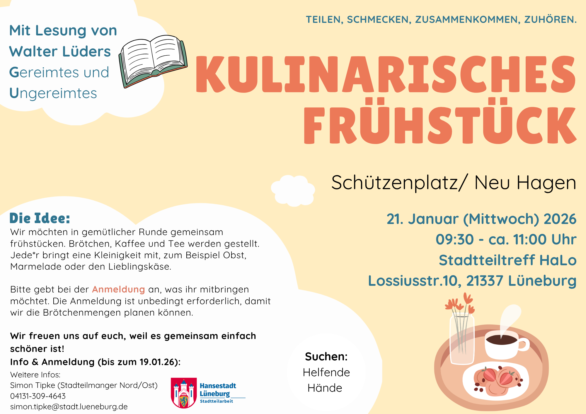 Am Mittwoch, 21. Januar 2026, veranstaltet das HaLo von 9:30 bis etwa 11 Uhr ein kulinarisches Frühstück mit einer Lesung von Walter Lüders.