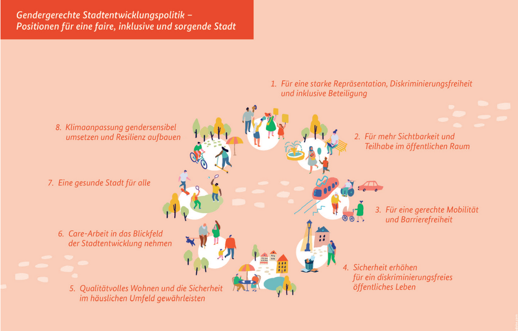 Dementsprechend sollte die Stadt ihre Entwicklung und Planung an den in ihr lebenden Menschen ausrichten. Mit der Einbeziehung der Gleichstellungsperspektive wird dies erreicht, denn dabei stehen die Verknüpfung von sorgenden Tätigkeiten mit Erwerbsarbeit, Wirtschaft, Umwelt und Gesundheit im Mittelpunkt.
