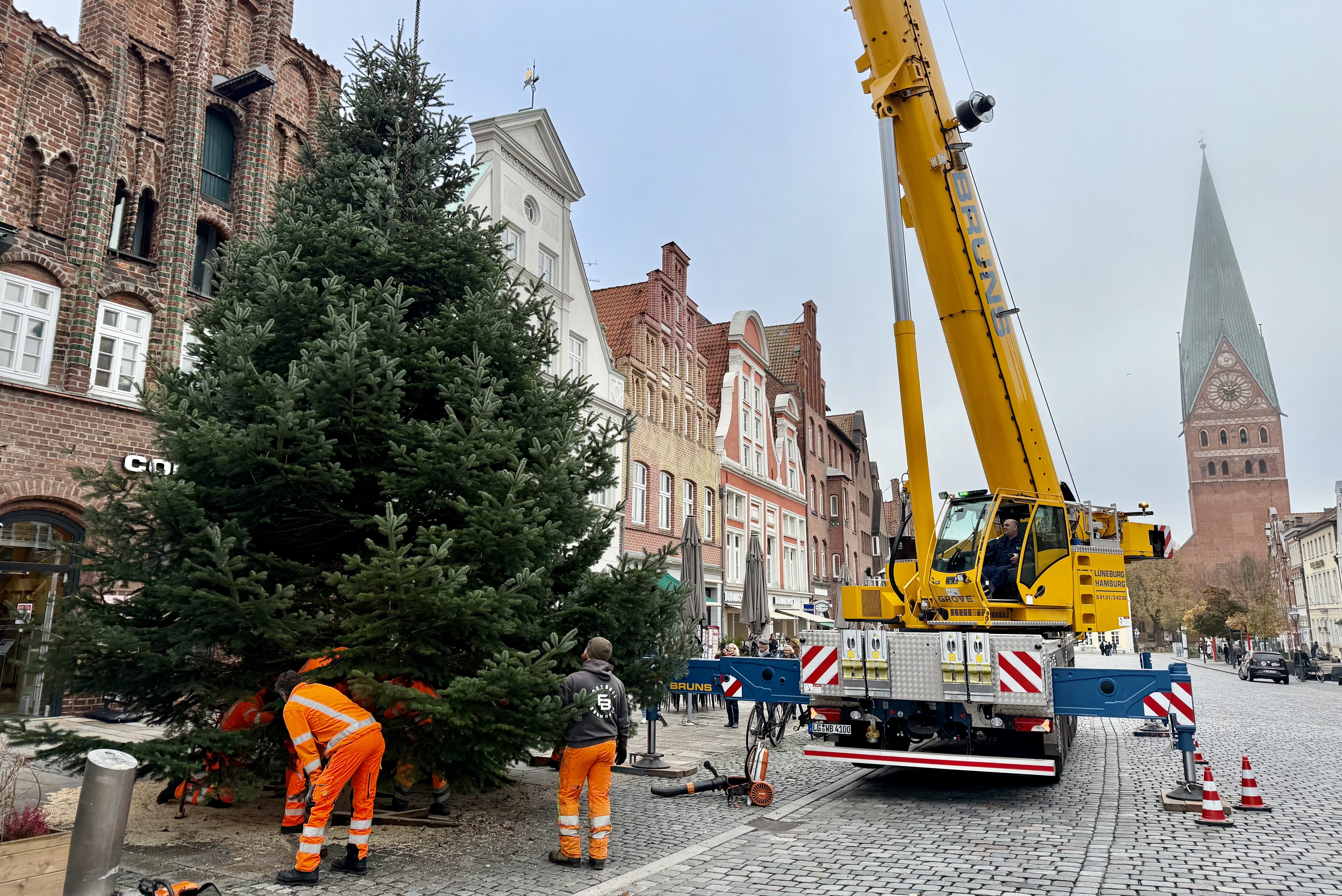 Der erste prachtvolle Christbaum ist heute beim Platz am Sande eingeflogen – eine rund 10 Meter hohe Nordmanntanne aus Mechtersen. Insgesamt zehn große Tannen werden in diesen Tagen im Stadtgebiet aufgestellt.