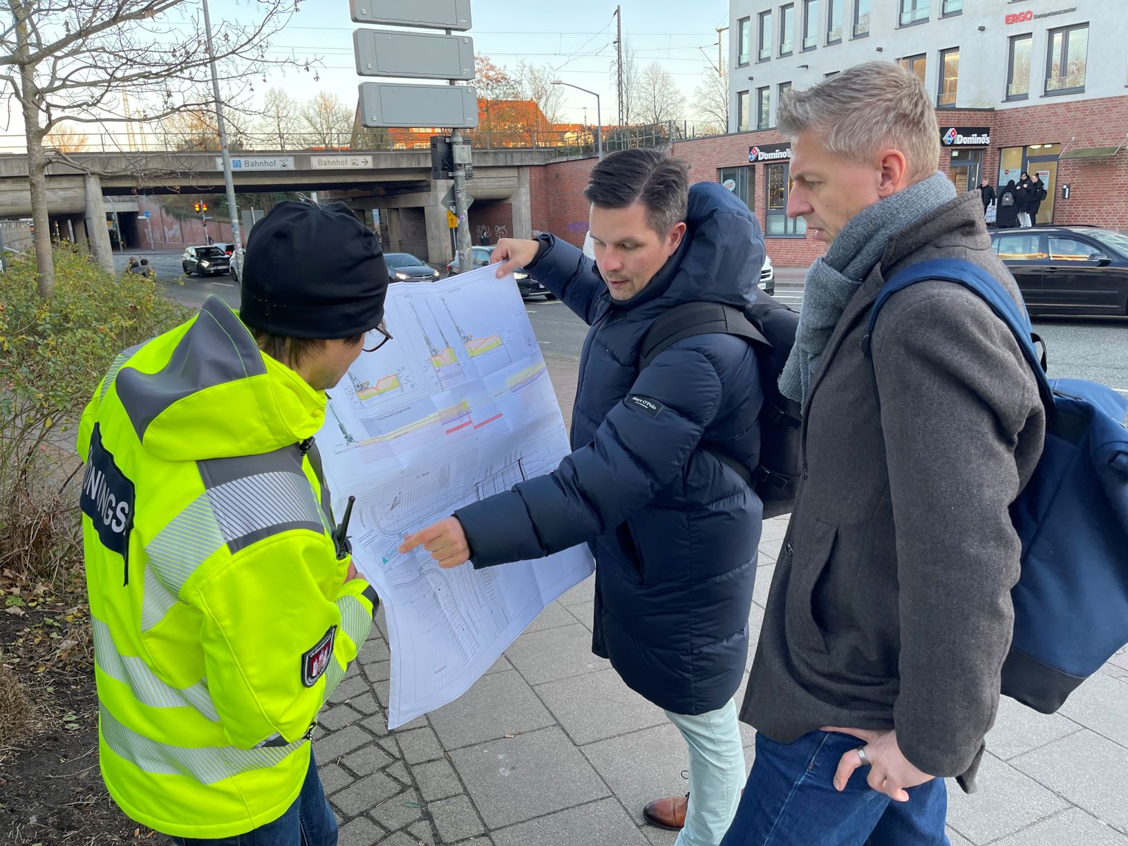 Vorort-Termin zur Verkehrsführung mit (v.l.) Dennis Lauterschlag (Bereichsleiter Ordnung und Verkehr), Alexander Matz (Fachbereichsleitung Tiefbau und Grün) und Jürgen Kipke (Fachbereichsleitung Mobilität).
