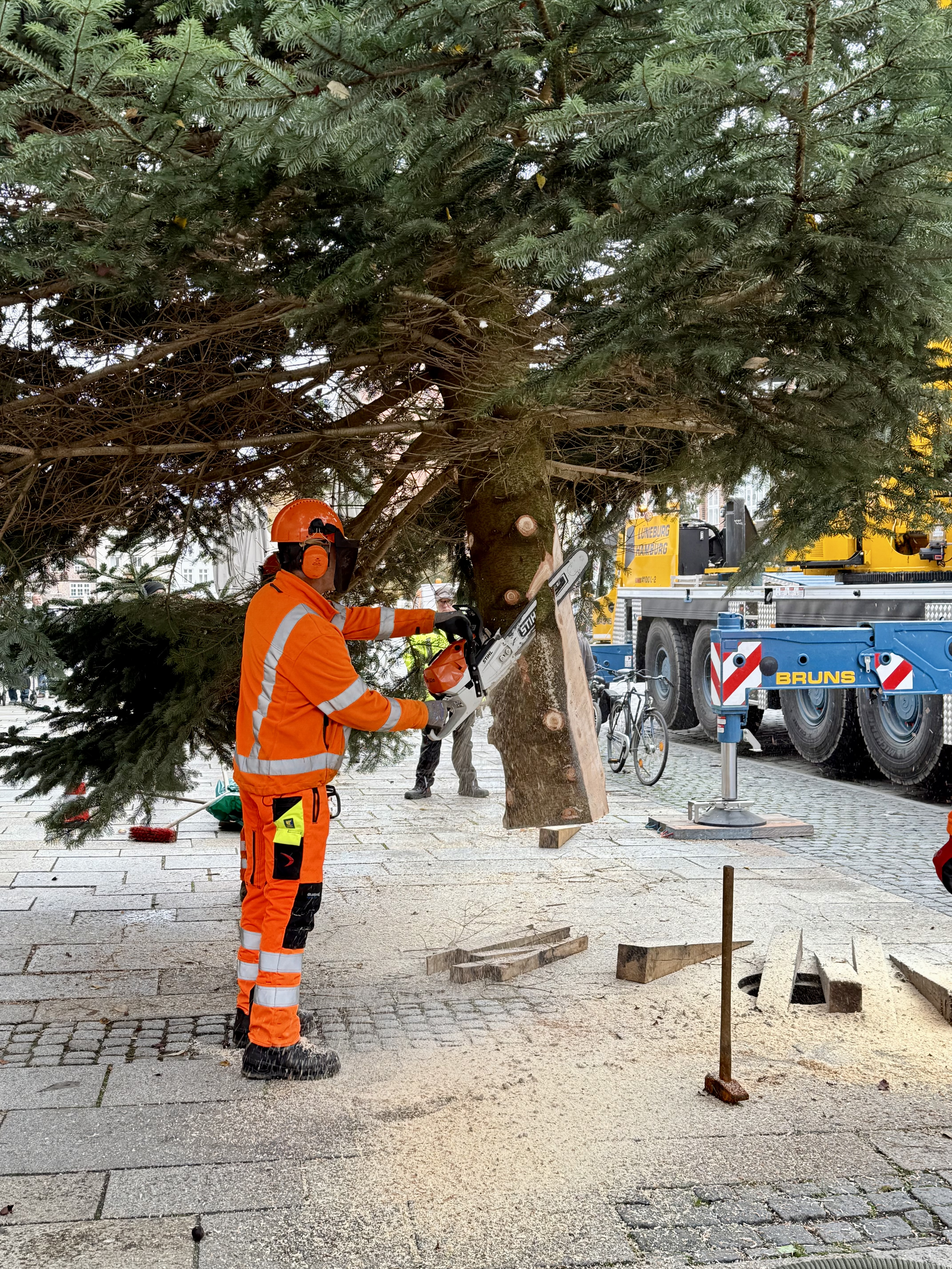 Wie jedes Jahr stammen die großen Tannen in der Innenstadt und in den Stadtteilen aus Privatgärten in Stadt und Landkreis. Die Stadt organisiert das Fällen und den Abtransport auf eigene Kosten. Für manche Gartenbesitzer:innen ist das eine willkommene Gelegenheit, wenn ein Baum über die Jahre zu groß geworden ist. „Wir bedanken uns für die tollen Tannen“, sagt Marktmeister Stegen.