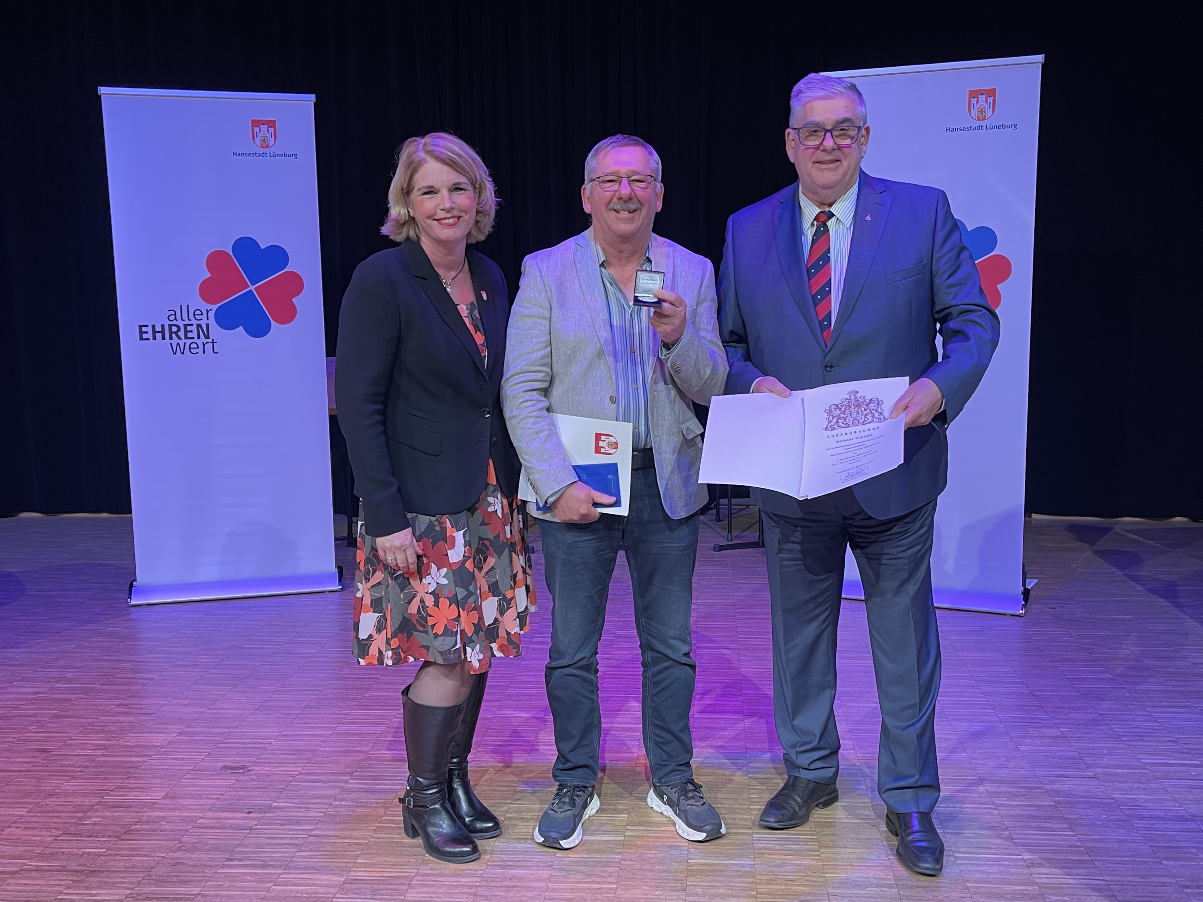 Die Ehrenmedaille der Hansestadt Lüneburg ging in diesem Jahr an Michael Gimball (Mitte) für sein Engagement im Ochtmisser SV. Laudator und Ochtmissens Ortsbürgermeister Jens-Peter Schultz und Lüneburgs Oberbürgermeisterin Claudia Kalisch gratulierten.