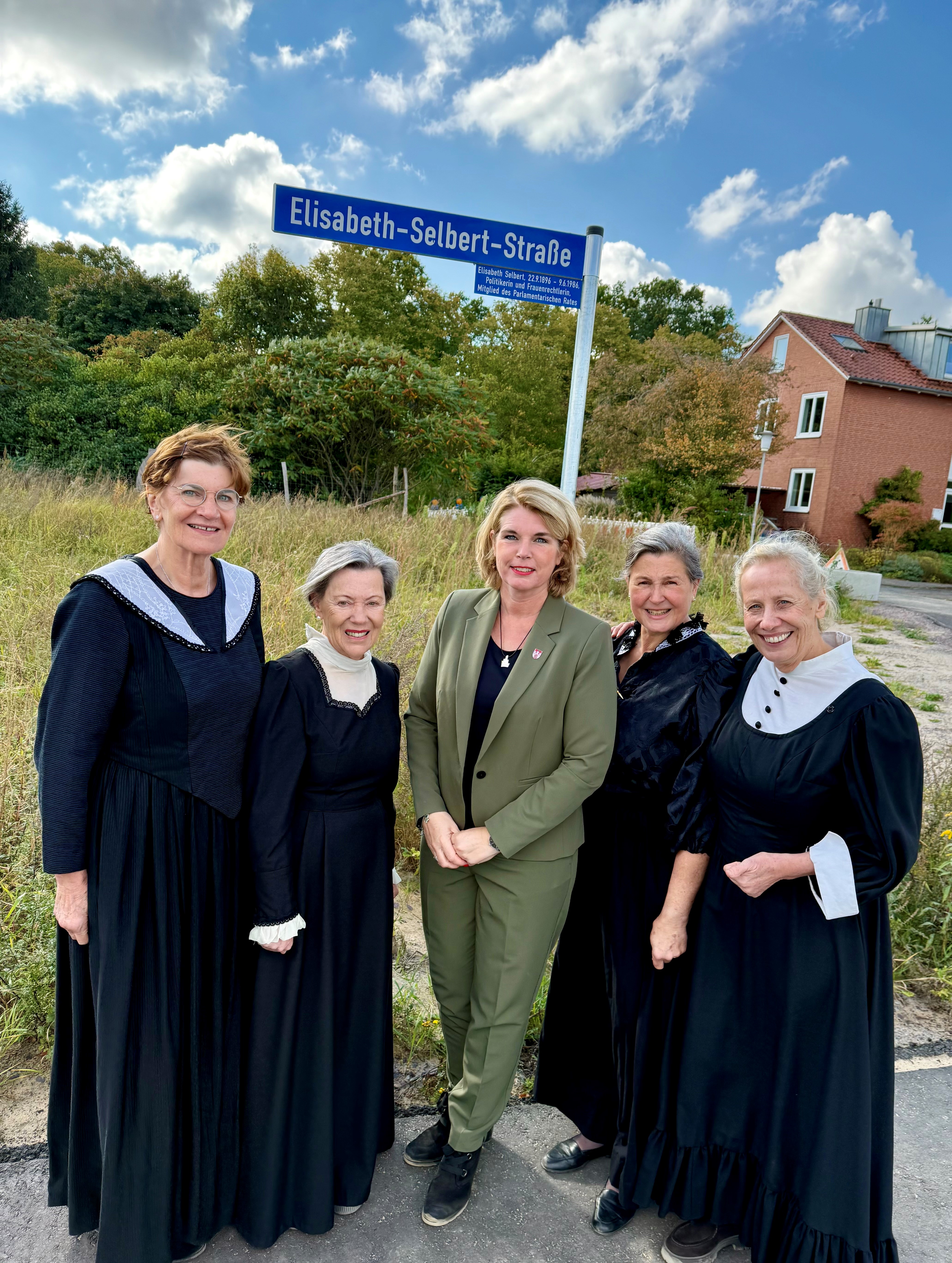Ute Baumeister (l.), Marie-Anne Henschke (2.v.l.), Birgit Meyer-Thaut (4.v.l.) und Karina Holst (r.) von den Soroptimistinnen Lüneburg und Lüneburgs Oberbürgermeisterin vor dem Straßenschild von Dr. Elisabeth Selbert im Neubaugebiet Wienebütteler Weg.