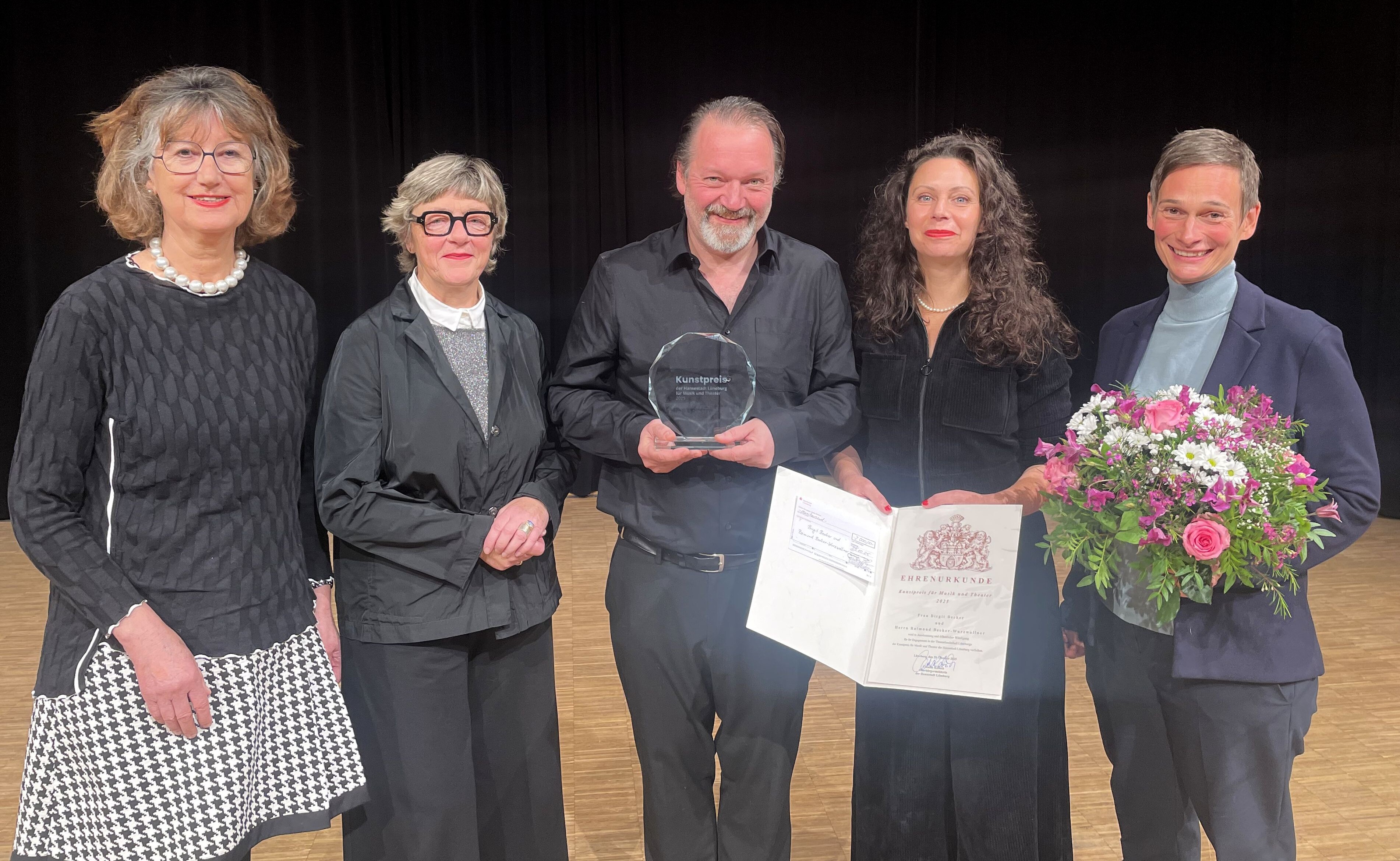 Hannelore Krome von der Ubuntu-Stiftung, Bürgermeisterin Hiltrud Lotze, die Preisträger Birgit Becker und Raimund Becker-Wurzwallner und die Laudatorin Carolin George bei der Verleihung des Kunstpreises für Musik und Theater.