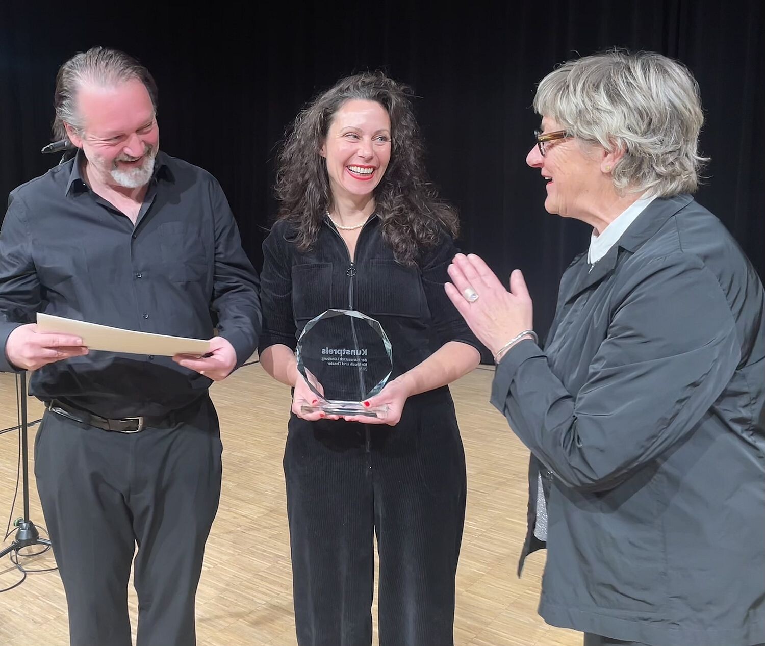 Bürgermeisterin Hiltrud Lotze überreichte den Preis stellvertretend für Oberbürgermeisterin Claudia Kalisch, die krankheitsbedingt nicht dabei sein konnte. Aus der Rede von Oberbürgermeisterin Kalisch zitierte sie: „Wer Theater macht, der bringt auch Menschen zusammen. Die Vielfalt der kulturellen Angebote ist ein Markenzeichen unserer Stadt. Die Preisträger zeigen uns immer wieder neue, differenzierte Perspektiven auf und stoßen den Diskurs an.“ So zum Beispiel beim Stück „Flächenbrand“ zur Klimakatastrophe oder bei der neusten Inszenierung „Wendepunkte“, bei der die Lebensgeschichten von Lüneburgerinnen und Lüneburgern auf die Bühne gebracht werden.