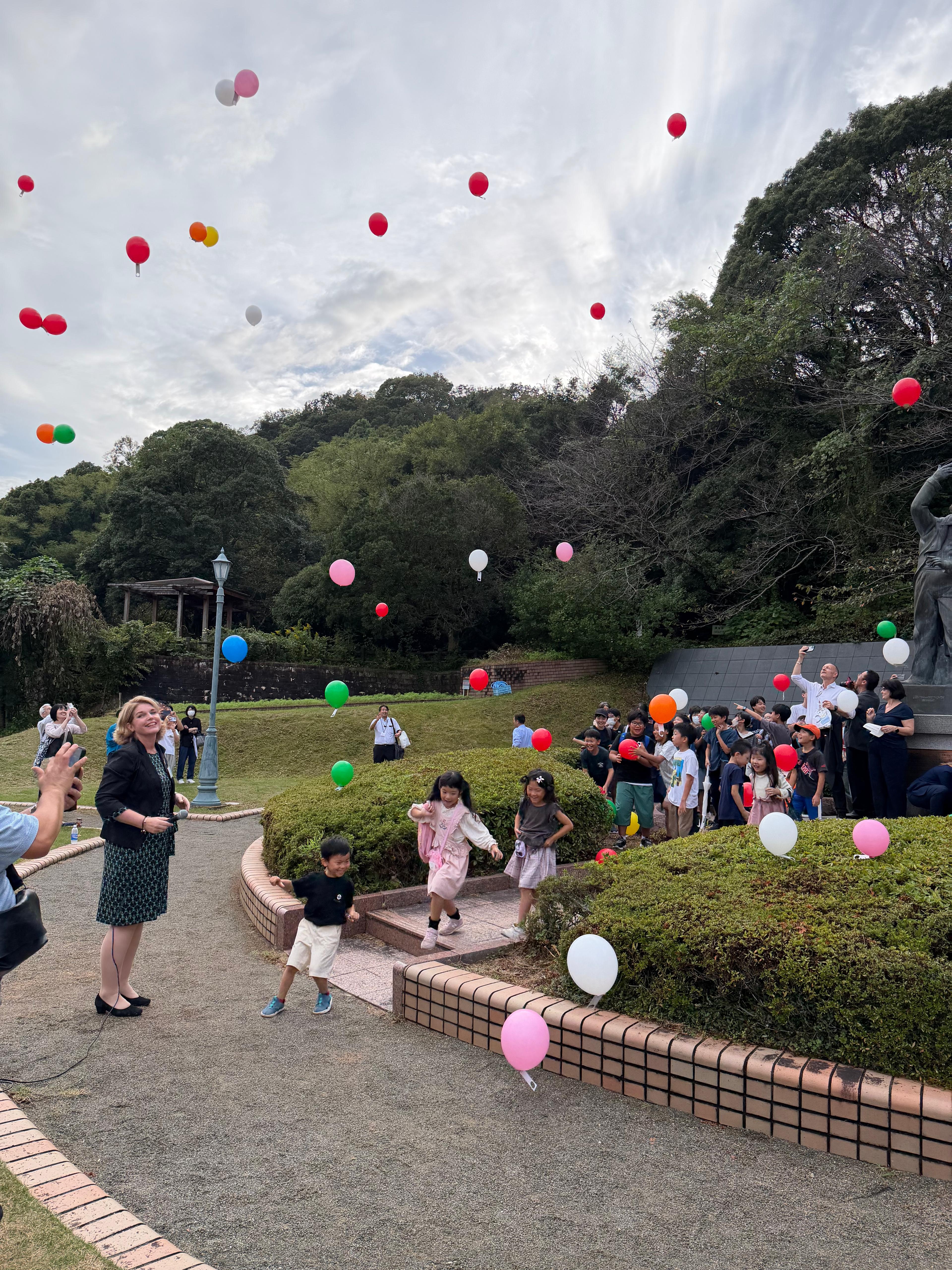 Auch am Kulturtag im Deutschen Haus erlebten die Teilnehmenden gemeinsam mit Oberbürgermeister Izumi und zahlreichen Bürger:innen einen Tag voller Begegnungen, Herzlichkeit und kulturellem Miteinander – gekrönt von bunten Luftballons mit Friedenswünschen, die in den Himmel stiegen. „Es war wunderbar zu sehen, dass auch junge Menschen an der Freundschaft teilhaben. Unsere Jugenddelegation bleibt noch 14 Tage länger in Japan – vielleicht sind sie es, die eines Tages das 100-jährige Bestehen dieser Partnerschaft feiern werden“, hofft Claudia Kalisch.