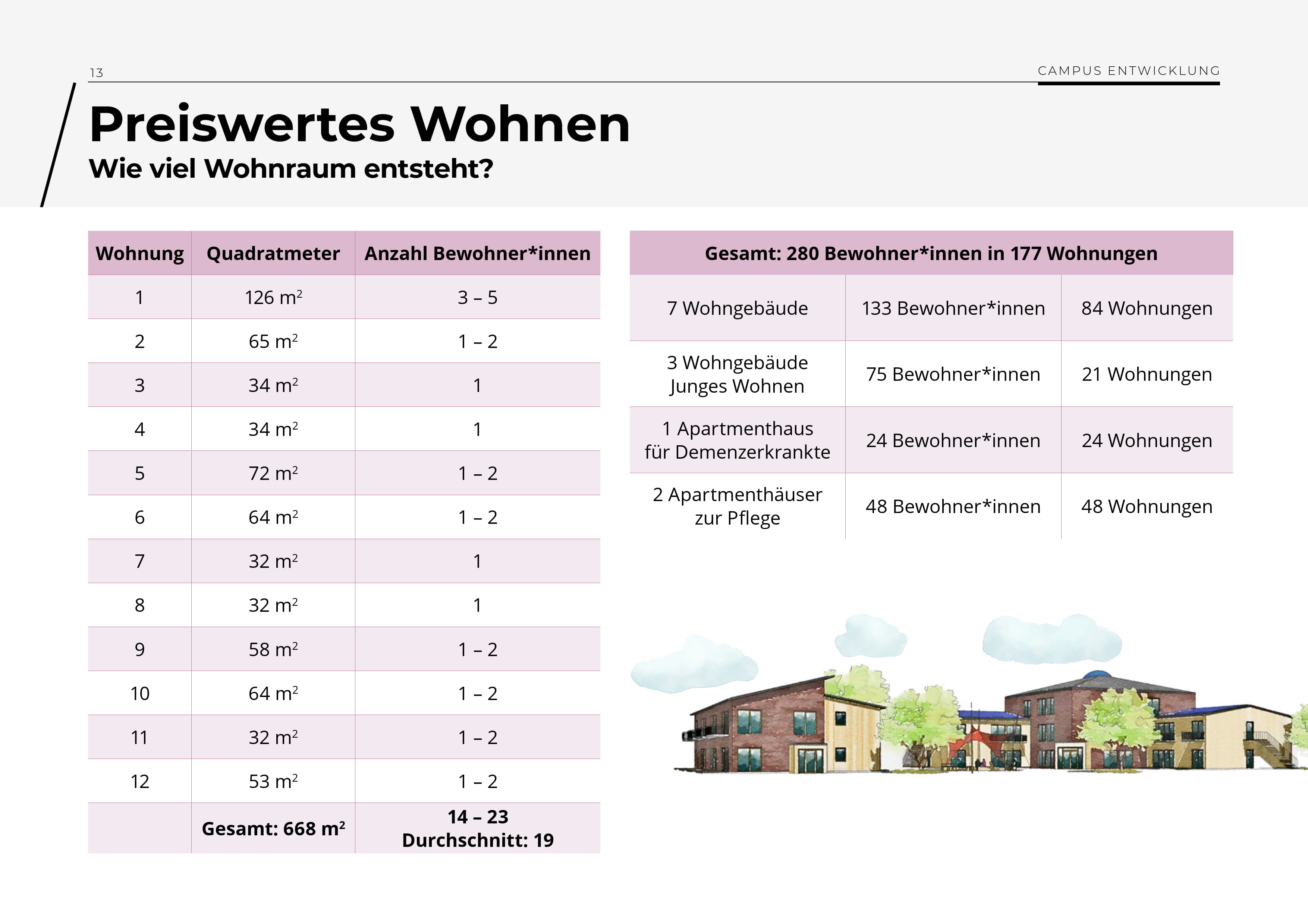 7 Wohngebäude mit 84 Wohnungen, 3 Gebäude „Junges Wohnen“ mit 21 Wohnungen, 1 Apartmenthaus für Menschen mit Demenz (24 Wohnungen), 2 Pflege-Apartmenthäuser mit 48 Wohnungen.