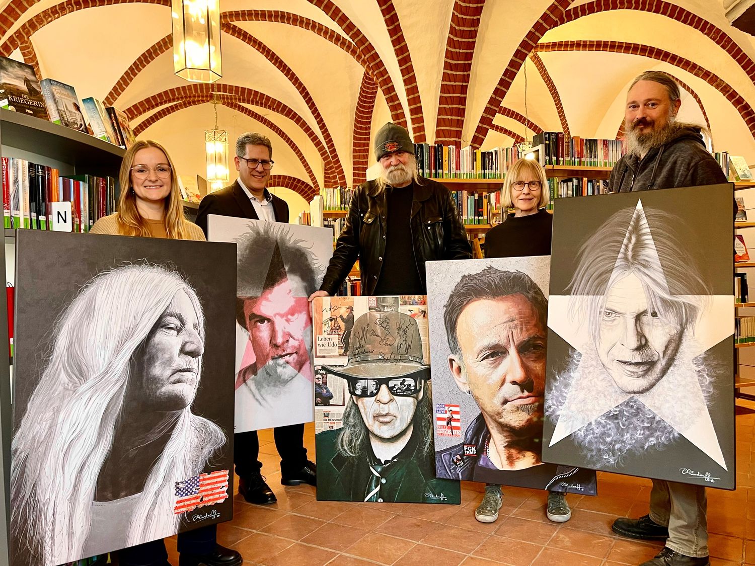 HANSESTADT LÜNEBURG. – David Bowie, Patti Smith, Johnny Cash und Bruce Springsteen. Diese und weitere Musikgrößen können bald in Lüneburgs Wohnzimmer einziehen – als Kunstwerke zum Ausleihen. Die Lüneburger Artothek, ein gemeinsames Angebot der Sparkassenstiftung und der Ratsbücherei, hat ihren Bestand um 18 neue Werke des Malers und Kulturpreisträgers Ole Ohlendorff erweitert. Es handelt sich dabei um sogenannte Fine Art Prints (Kunstdrucke).