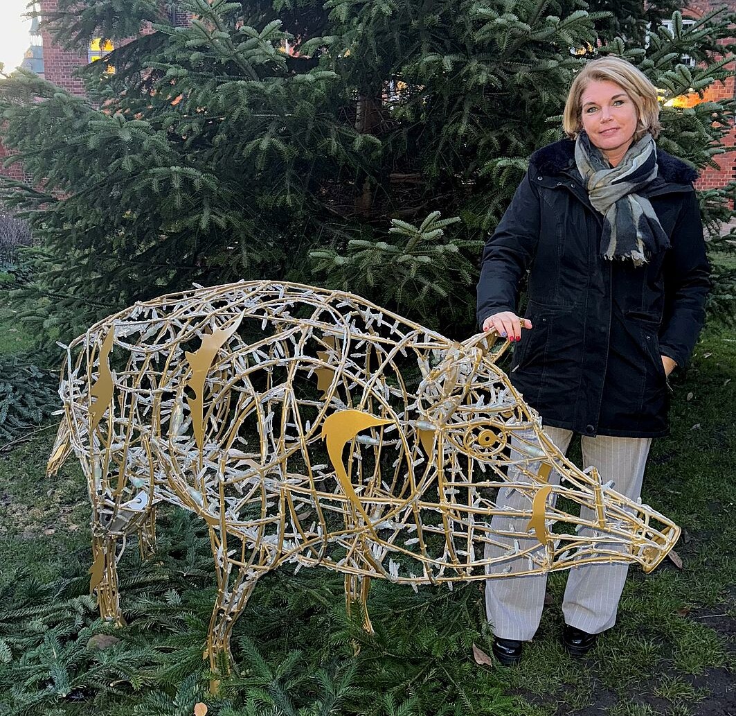 Oberbürgermeisterin Claudia Kalisch mit der neuen Salzsau im Rathausgarten. Aktiviert wird das Lichtobjekt in der Woche der Weihnachtsmarkteröffnung.