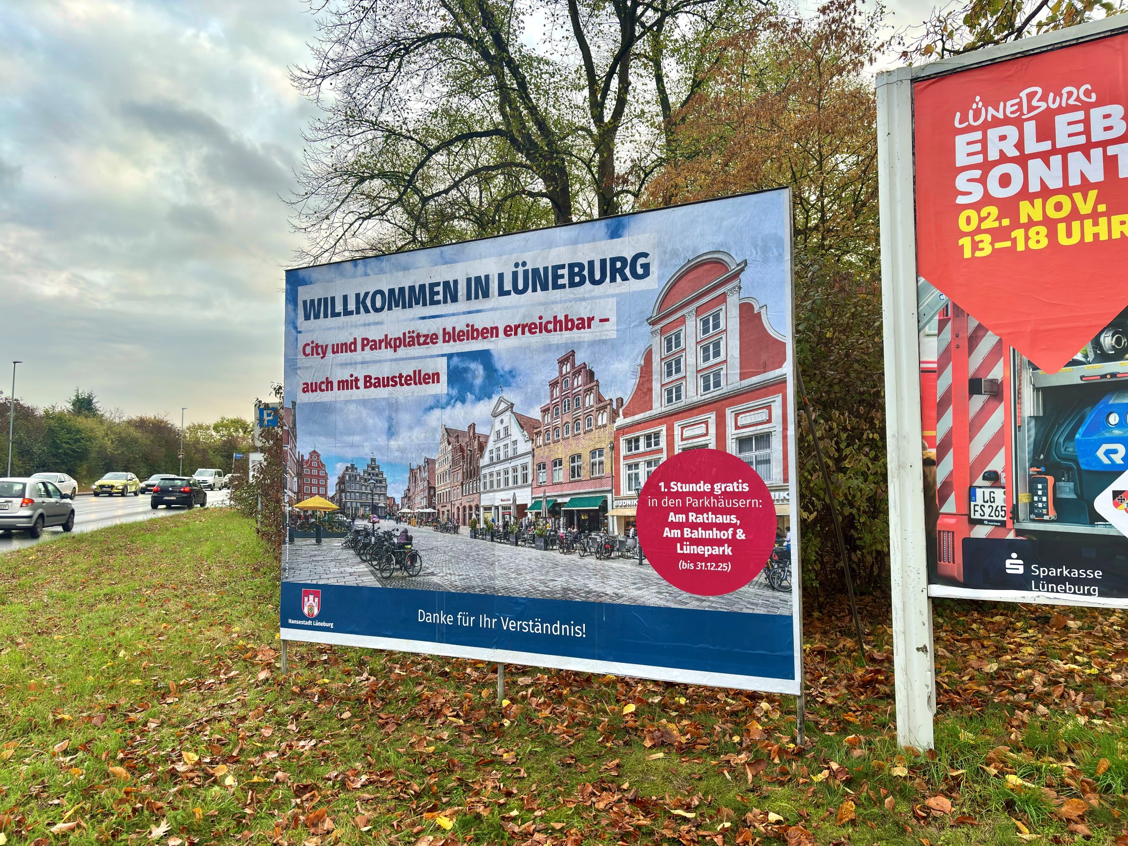 Weiterhin sollten alle die attraktive Lüneburger Innenstadt mit all ihren Angeboten ansteuern – und sich nicht von den Baustellen im Stadtgebiet davon abbringen lassen. Das unterstreicht die Stadt jetzt mit Plakaten, die seit Mittwoch, 22. Oktober 2025, an sechs Standorten an den Stadteingängen sowie im Stadtgebiet aufgestellt sind: „Willkommen in Lüneburg“, begrüßt die Hansestadt ihre Besucherinnen und Besucher.