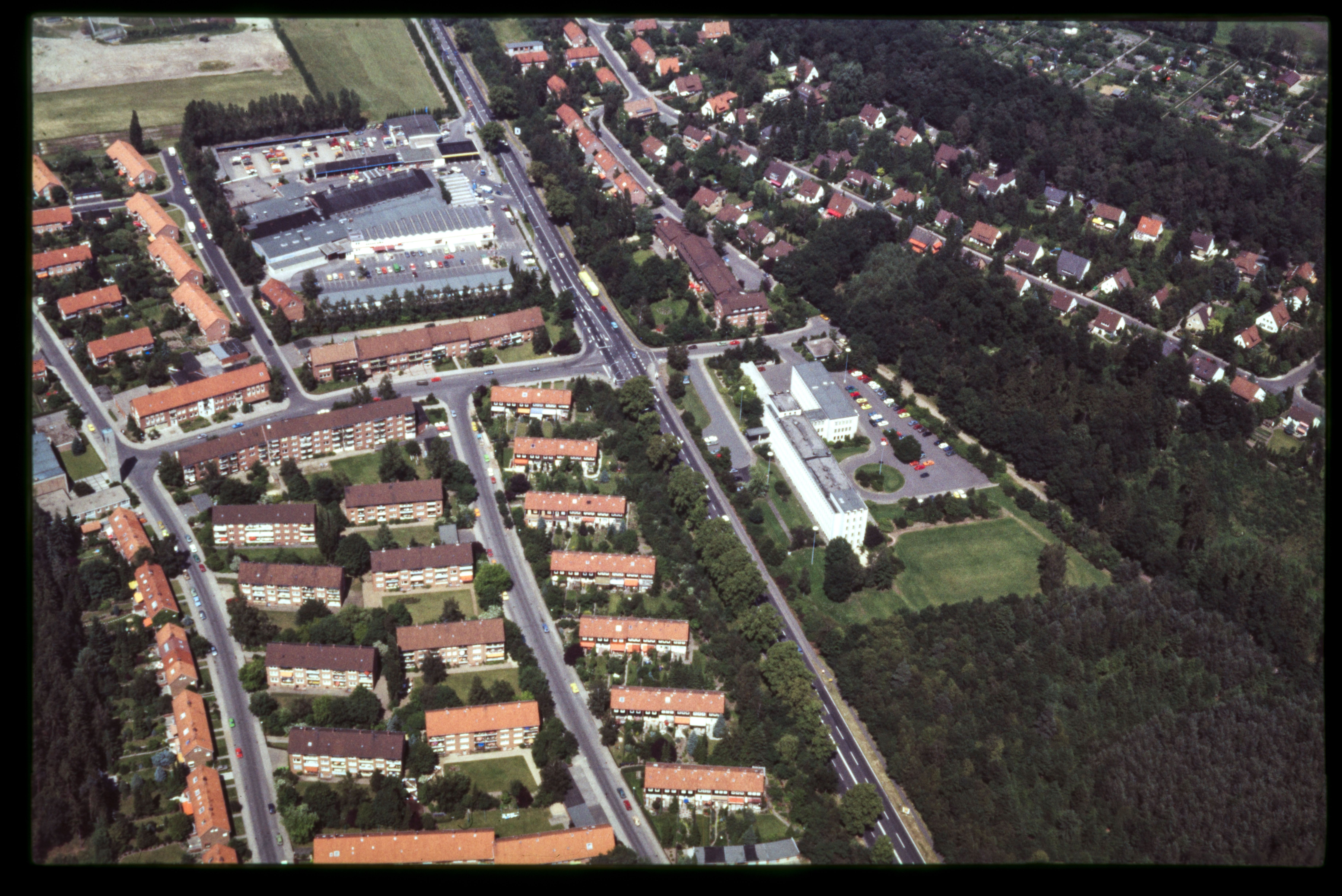 1984: Blick von oben Richtung Norden auf den Bockelsberg, der seinen Namen ursprünglich von der buckeligen Landschaft hat, die aber schrittweise für die Bebauung begradigt wurde.