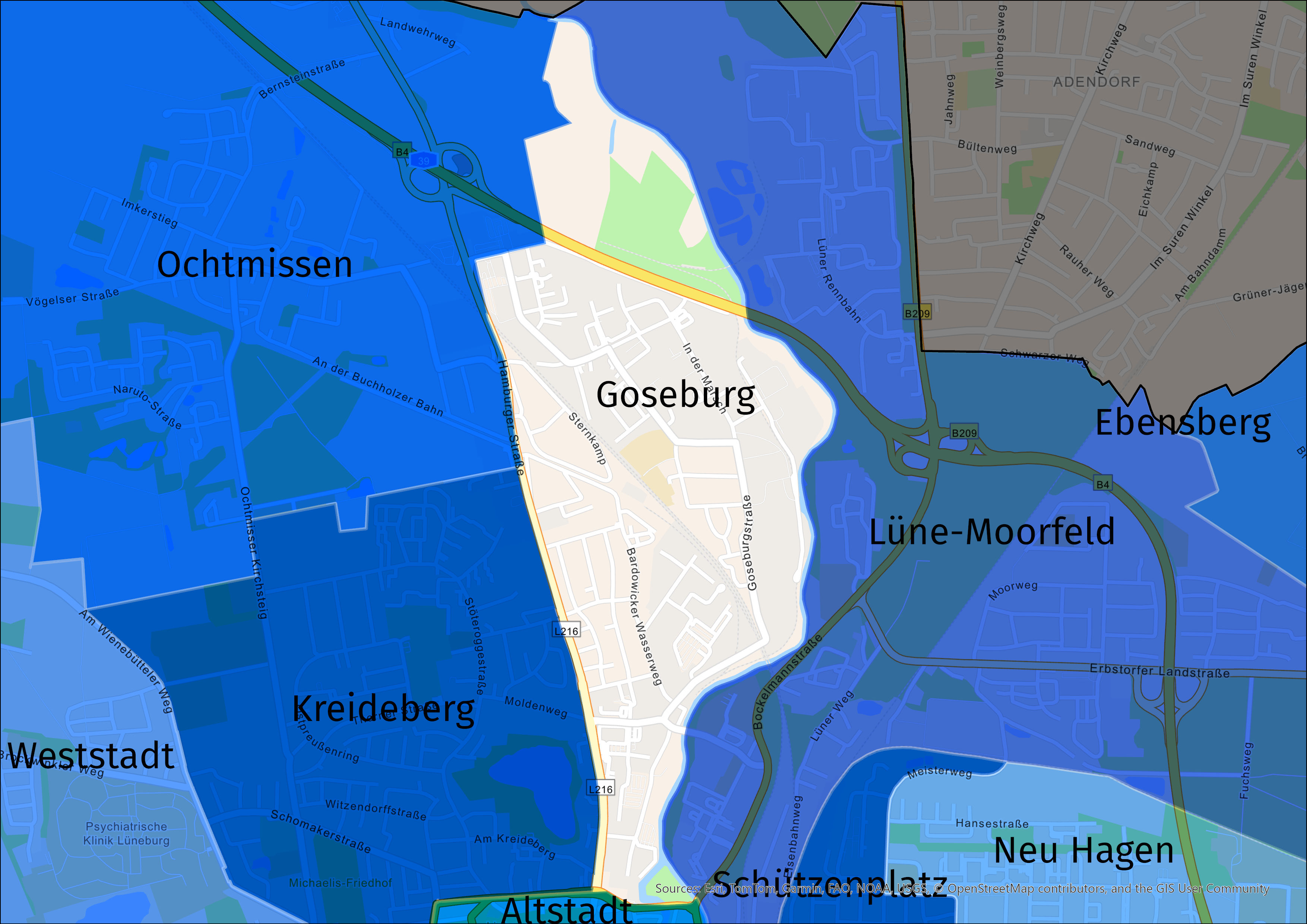 Im Westen wird Goseburg-Zeltberg begrenzt durch die Hamburger Straße, im Norden verläuft die B4 (Ostumgehung), hier beginnt die Autobahn in Richtung Hamburg.