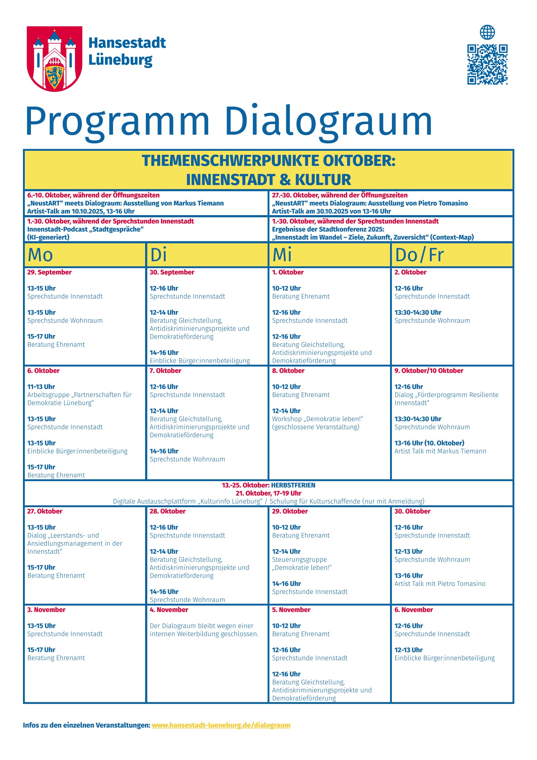 Unter dem Motto „Gemeinsam unsere Stadt gestalten“ lädt die Hansestadt Lüneburg alle Interessierten in den Dialograum (Grapengießerstraße 47) ein. Direkt in der Innenstadt gibt es dort die Möglichkeit, sich mit Mitarbeitenden der Stadtverwaltung, zivilgesellschaftlichen Akteur:innen und Bürger:innen in lockerer Atmosphäre auszutauschen und sich über aktuelle Themen zu informieren.