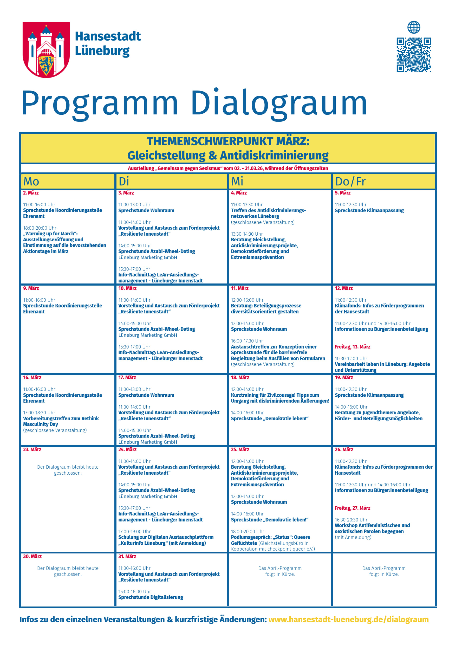 Im März gestalten das Gleichstellungsbüro der Hansestadt Lüneburg und die dort verortete Koordinierungsstelle Teilhabe, Antidiskriminierung und Extremismusprävention ein Programm rund um die Themen Gleichstellung und Antidiskriminierung – in Zusammenarbeit mit verschiedenen Kooperationspartner:innen.