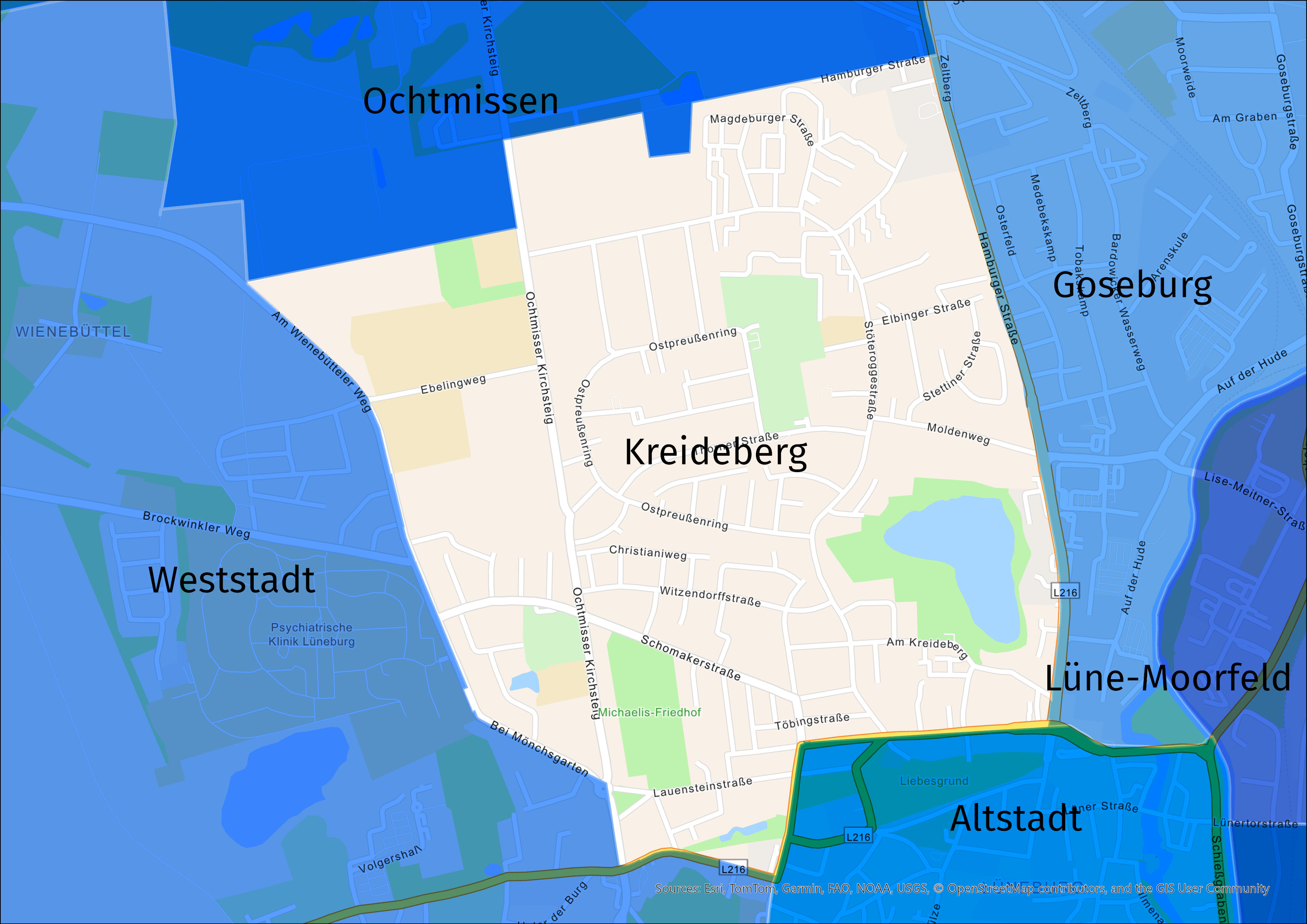 Der Stadtteil Kreideberg liegt im Nordwesten der Stadt Lüneburg zwischen den Stadtteilen Weststadt, Ochtmissen, Goseburg-Zeltberg und Altstadt.