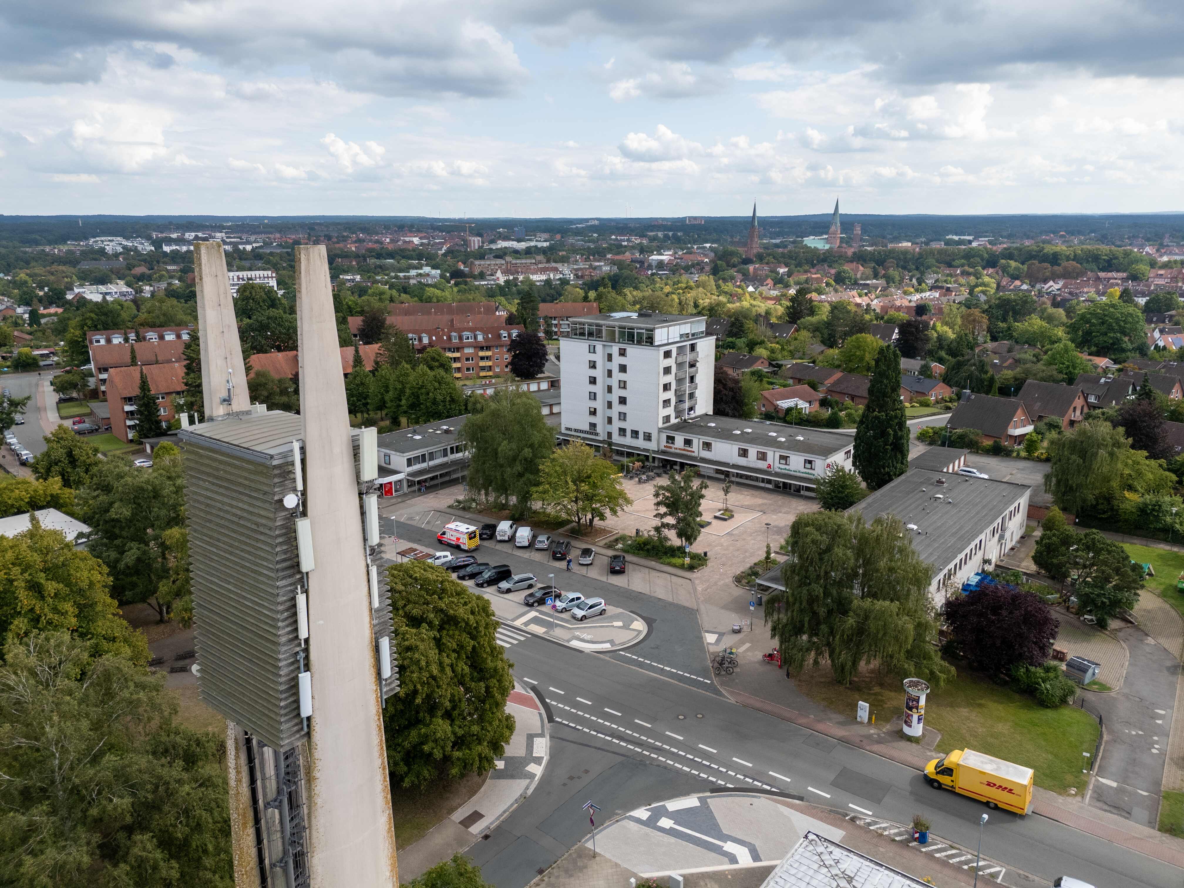 1973: Blick von der Thorner auf die Neuhauser Straße und die berühmte Wäscheklammer, den Turm der 1971 eingeweihten Pauluskirche. Der Lüneburger Architekt (und spätere LSK-Präsident) Gerd Meyer-Eggers hat sie entworfen.