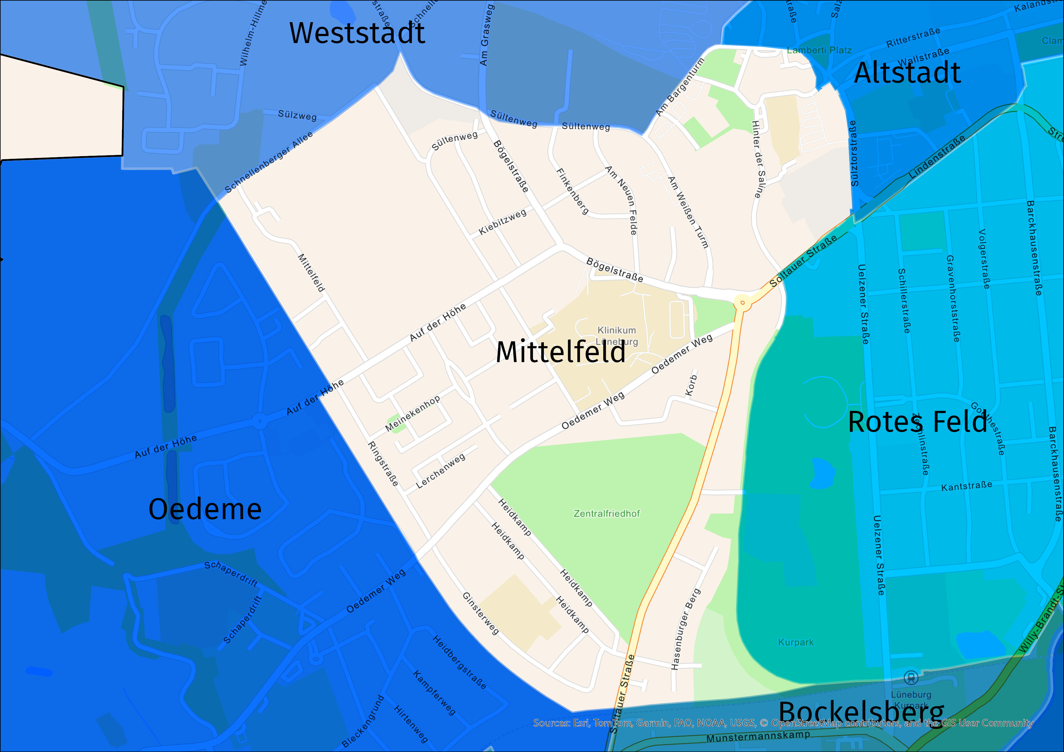 Der Stadtteil Mittelfeld liegt im Westen und wird umschlossen von der Altstadt, vom Roten Feld, Bockelsberg, Oedeme und Weststadt.