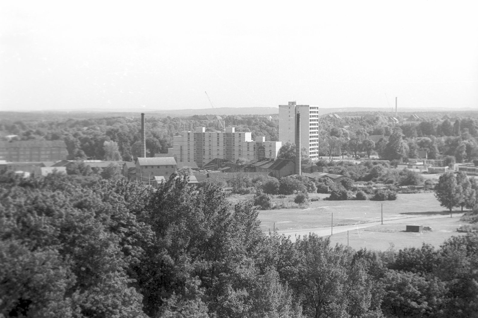 1979: Blick vom 56 Meter hohen Kalkberg auf die Wohnblöcke Am Weißen Turm und den Schornstein der alten Saline. Ein Jahr später wurde die Saline geschlossen.
