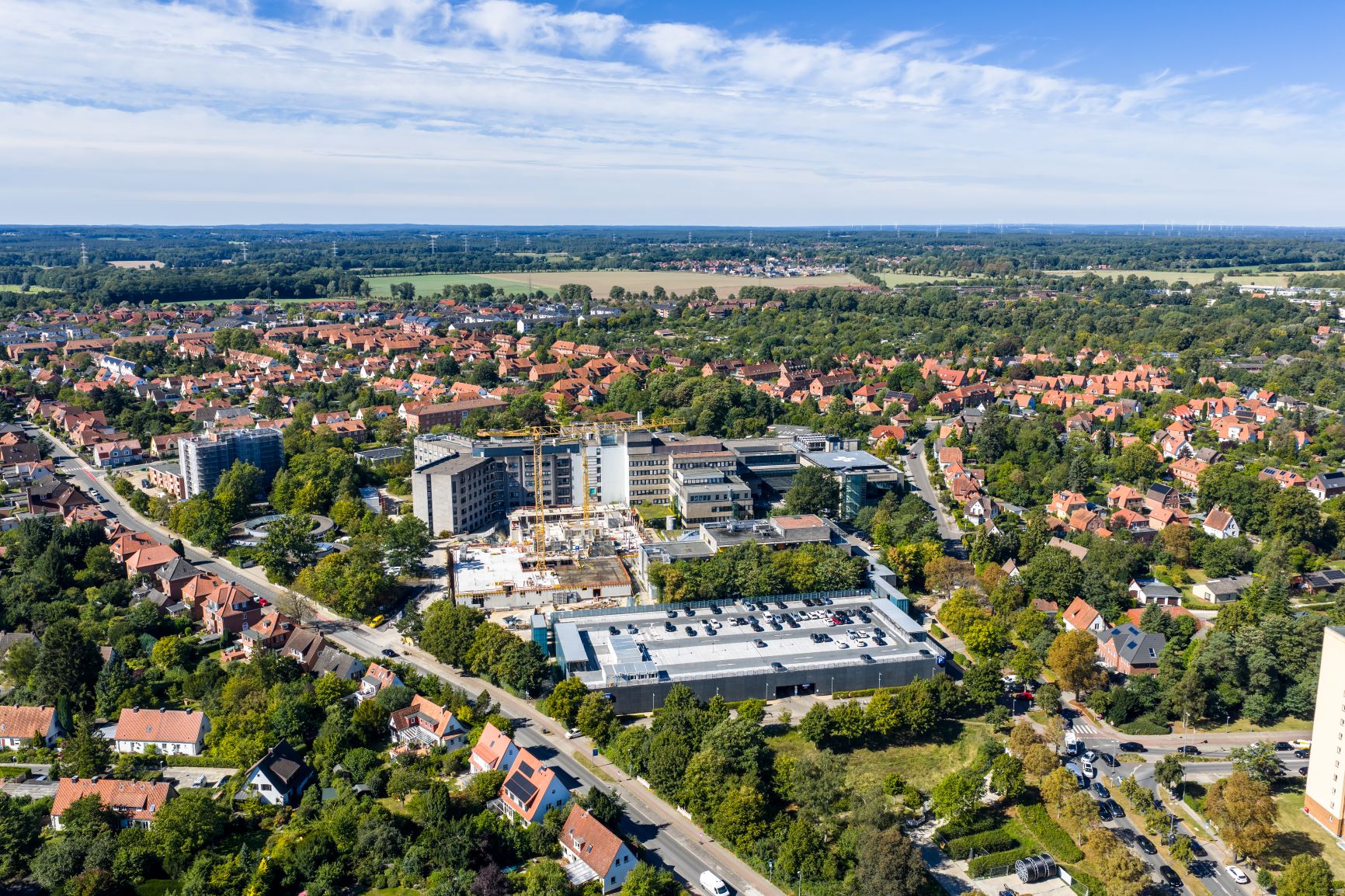 Blick auf das Klinikum Lüneburg und die Dächer der Stadt.